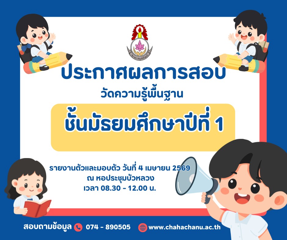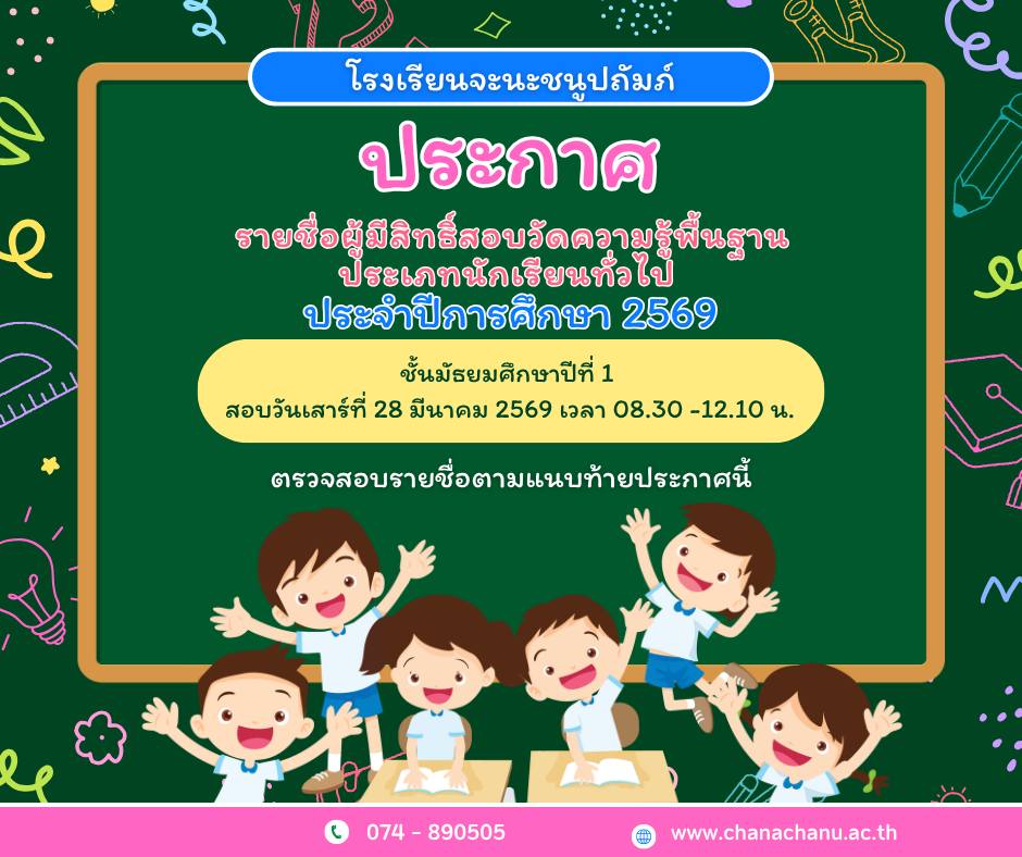 ประกาศโรงเรียนจะนะชนูปถัมภ์ เรื่อง ประกาศผลการสอบวัดความรู้พนฐานนักเรียนชั้นมธยมศึกษาปีที่ 1 ประเภทห้องเรียนทั่วไป ปีการศึกษา 2569
