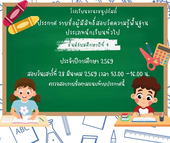 ประกาศโรงเรียนจะนะชนูปถัมภ์ เรื่อง ประกาศผลการสอบวัดความรู้พื้นฐานนักกเรียนชั่นมัธยมศึกษาปีที่ 4 ประเภทห้องเรียนทั่วไป ปีการศึกษา 2569