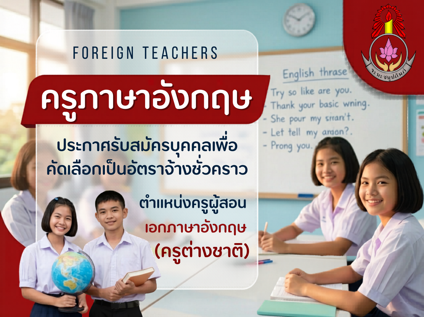ประกาศโรงเรียนจะนะชนูปถัมภ์ เรื่อง ประกาศรายชื่อผู้ผ่านการคัดเลือกบุคคลเพื่อเป็นอัตราจ้างชั่วคราว ตำแหน่งครูผู้สอน วิชาเอกภาษาอังกฤษ (ครูชาวต่างชาติ)
